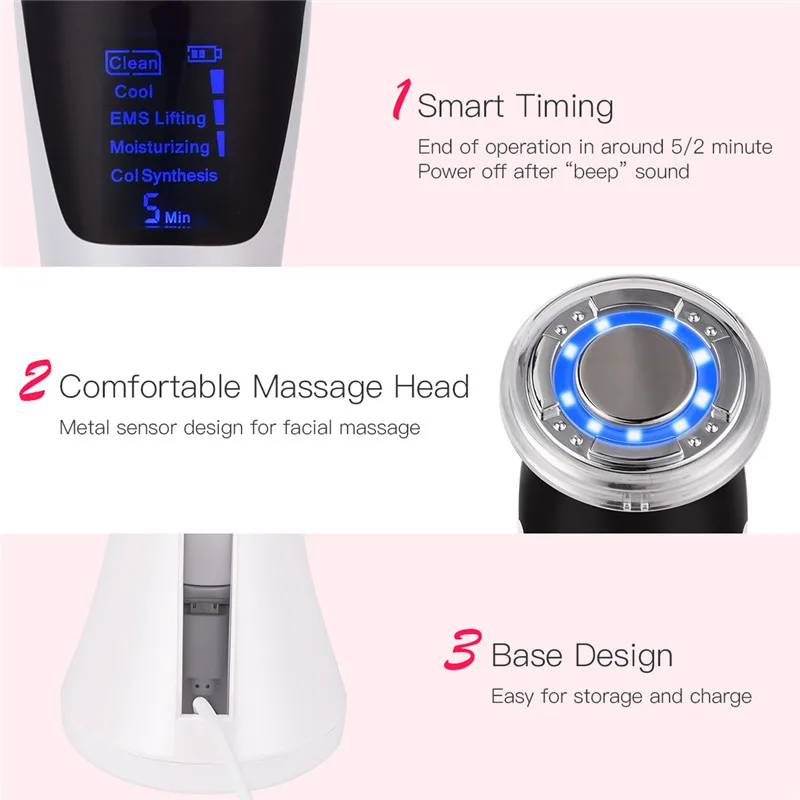 1) EMS micro-current: EMS micro-current stimulus gets deeply into the subcutaneous tissue and muscle, stimulating metabolism and reproduction and cell collagen. It can help to repair the elasticity of skin, dilute wrinkles.2) Sonic function: When sonic function works on skin, it can help to vibrate skin cells for gentle massage, improving the circulation of local blood and lymph.3) Blue light care: blue light is effective for diminishing inflammation and anti-acne, shrink pores, balance oil and water.4) Red light care: Promote blood circulation, increase the skin elasticity, improve skin condition, so that it can succeed in antioxidant and skin repair.5) Ion and anion function: efficient to lead in lotion for better nutrition absorption, as well as effective impurities leading out.Attention: