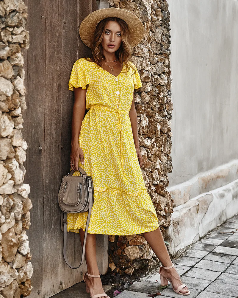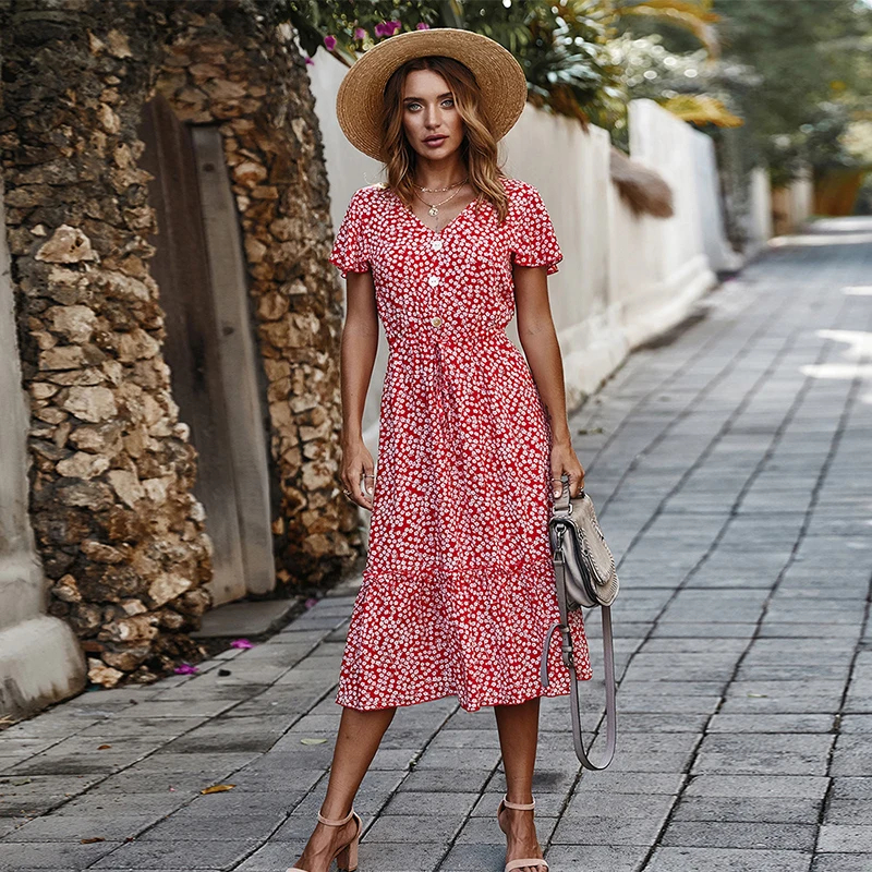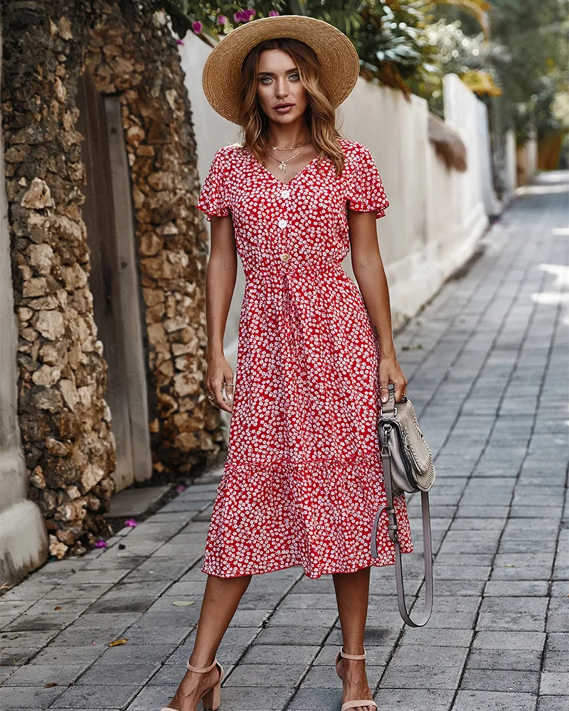 Best Price Comparison With Summer Floral Print Midi Dress Women Short Sleeve V-neck Flower Dresses Summer Ruffles Sleeve Dress Vestidos 2020