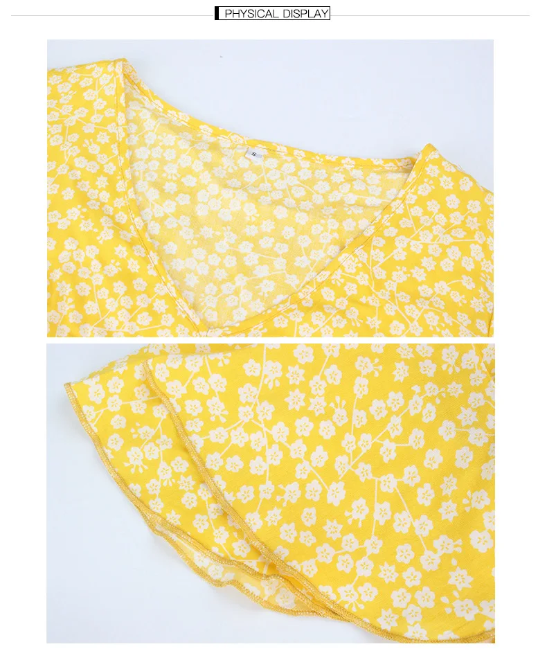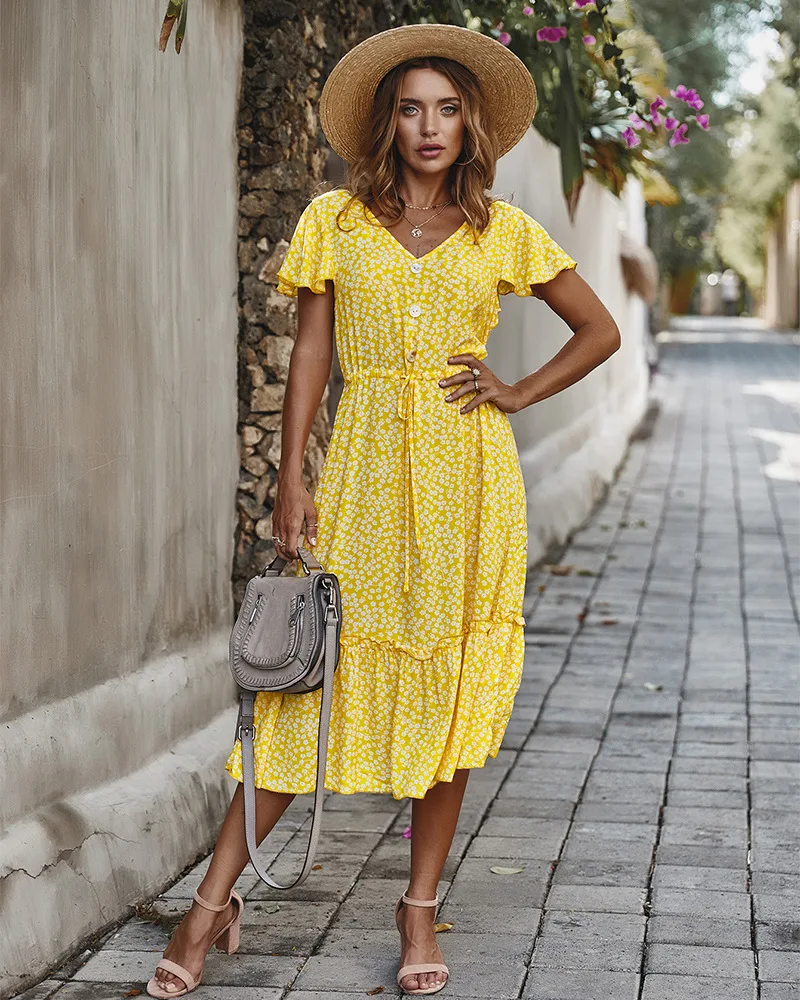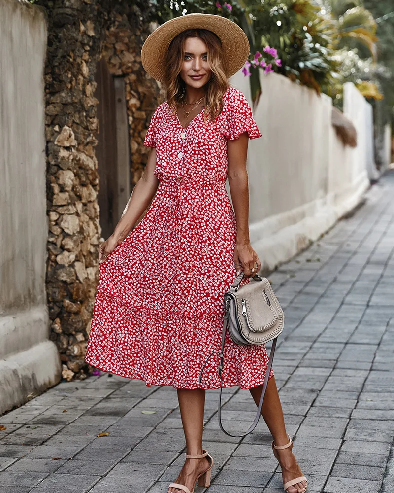 | Summer Floral Print Midi Dress Women Short Sleeve V-neck Flower Dresses Summer Ruffles Sleeve Dress Vestidos 2020 |