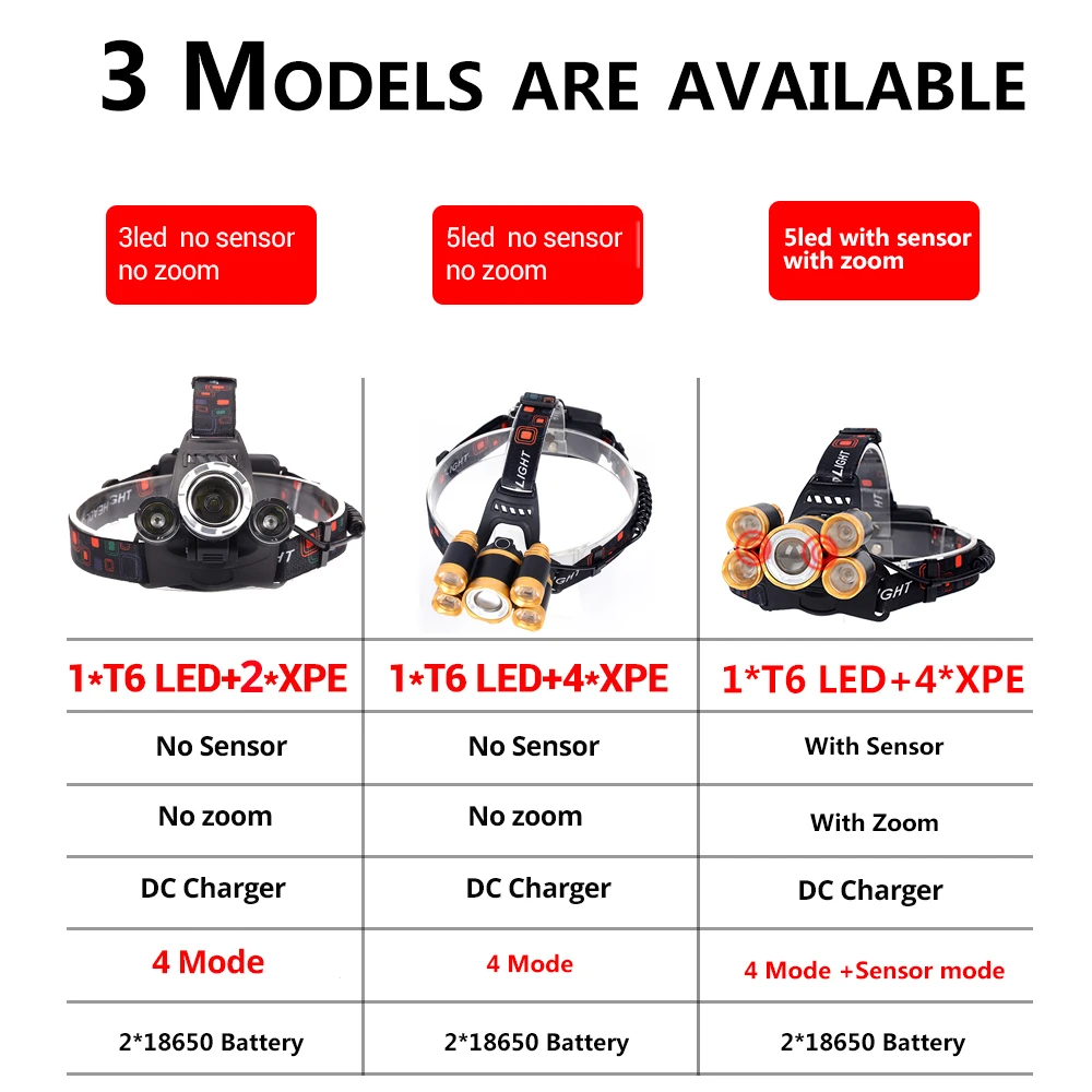 1: This product is divided into two models. You can choose 5LED Headlamp with sensor switch, or you can choose 3/5LED Headlamp with no have the sensor switch.2: 95% of buyers will buy batteries and accessories, because our batteries are of very good quality, high capacity and low price.Note: