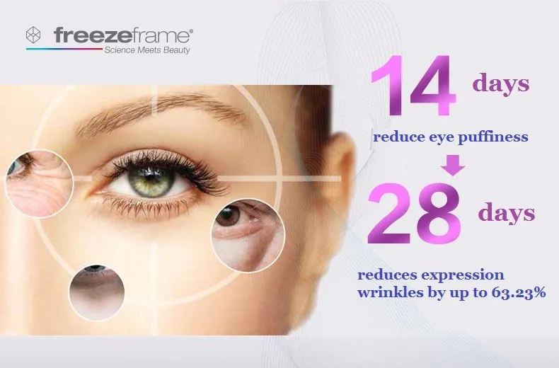freezeframe revitalEYES also contains a safe, gentle tissue tightening agent which lifts away mild to moderate lines and wrinkles as well as puffiness within 10 minutes to an hour. This instant lift, combined with the energising and brightening effect of vitamin C, and the moisture infusions of hyaluronic acid, provides an effect on wrinkles, puffiness and dark circles from day 1.